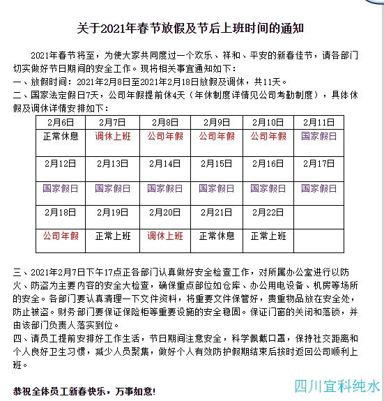 2021春節(jié)將至,為使大家共同度過一個歡樂、祥和、平安的新春佳節(jié),請各部門切實做好節(jié)日期間的安全工作?,F(xiàn)將相關(guān)事宜通知如下: